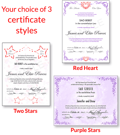 The framable certificate is inscribed with the star name you select and the star's astronomical SAO number and constellation location.