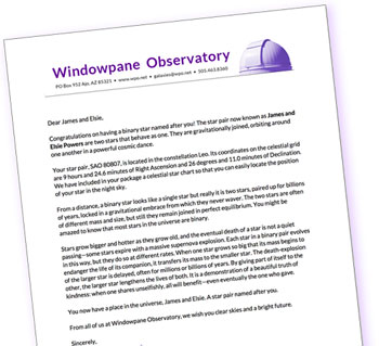 Your Name a Binary Star gift package will contain a personally written letter from our Chief Astronomer with a scientific profile of the star pair and a fascinating explanation of the amazing phenomenon of stars.